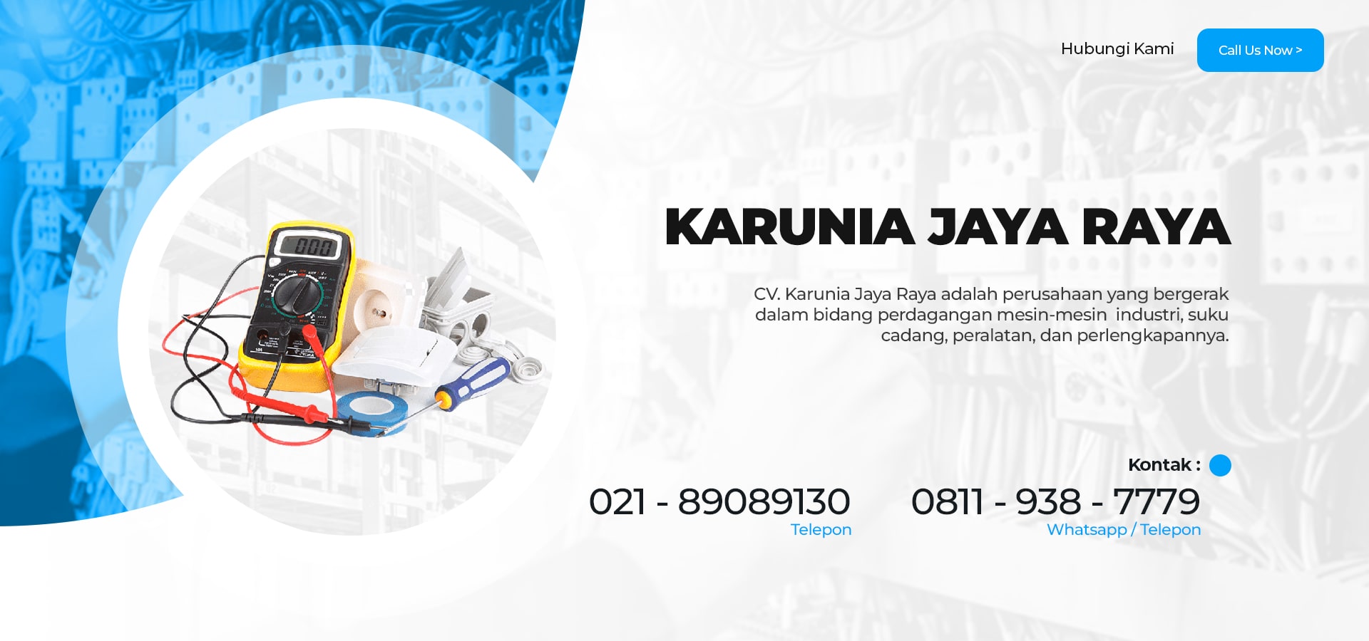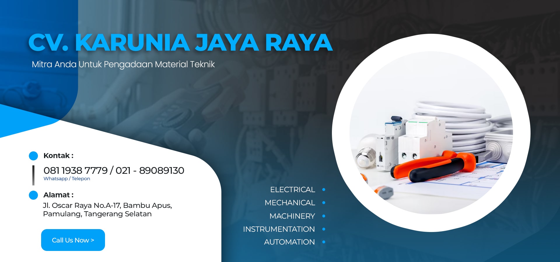 CV. Karunia Jaya Raya adalah perusahaan yang bergerak dalam bidang perdagangan mesin-mesin industri, suku cadang, peralatan, dan perlengkapannya. Kami merupakan supplier dan importer berbagai material-material elektrical, mekanikal, sipil, mesin-mesin industri, instrumentation, automation, dll. Semua produk yang kami sediakan memiliki kualitas yang terbaik dipasaran, karena kami selalu mementingkan kualitas dari produk kami untuk kepuasan semua pelanggan kami.